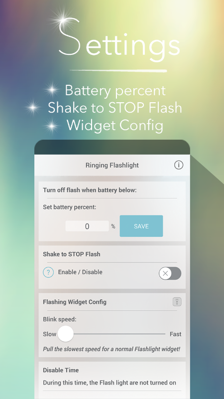 - Allow you to temporary disable the flashing feature day by day, time to time. You could add many time span in a day as you want inside Manage Disable Times screen.