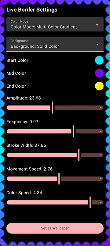 Odmień swoje urządzenie z systemem Android dzięki Ripple Border, żywej, dynamicznej tapecie, która doda świetlistą, animowaną ramkę wokół ekranu. Tę dynamiczną tapetę wyposażono w liczne opcje personalizacji, dzięki którym dopasujesz ją do swojego nastroju, osobowości lub estetyki.