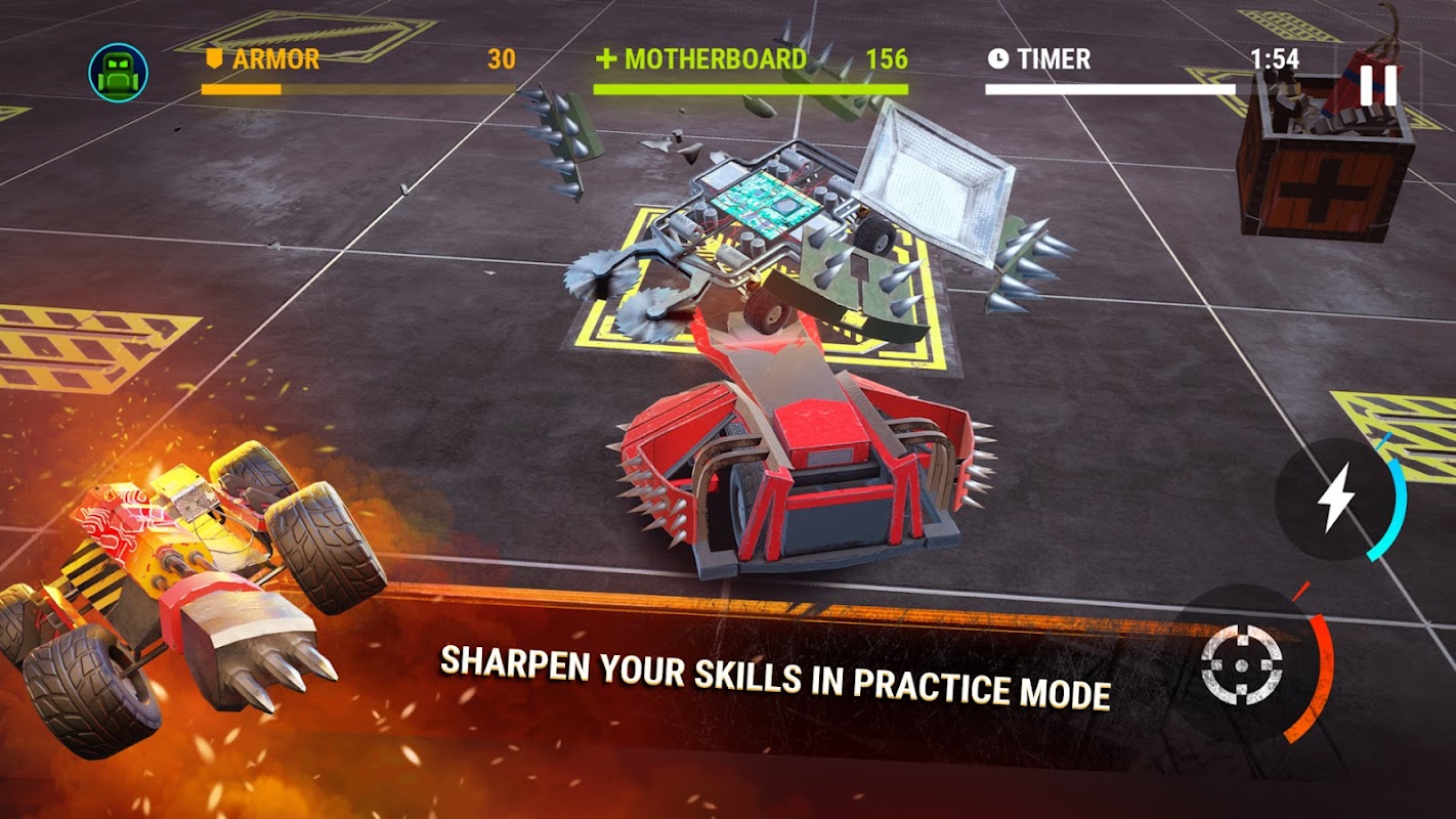 Walcz ze swoimi super mechami na wielu arenach bitewnych z dodatkowymi przeszkodami - pułapkami, kolcami, zabijającymi piłami, piekielnymi wznosami, wyciorami itp. Wchodź w interakcję z obiektami na arenie bitewnej (skrzynie, gaśnice) i naucz Twoja przysługa. Zdobywaj punkty doświadczenia w grach walki robotów i uzyskaj dostęp do personalizacji minibota - nowej zbroi, broni i stylów, aby uzyskać więcej zapierających dech w piersiach wojen samochodowych.