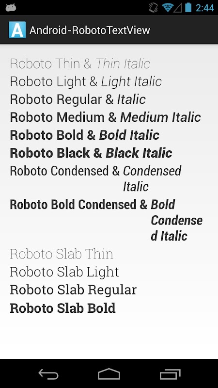 Implementation of a TextView with native support for all the Roboto fonts on all versions of Android.