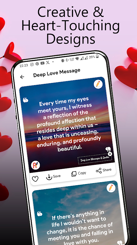 Niezależnie od tego, czy jesteś w długoterminowym związku, rozpoczynasz nową historię miłosną, czy po prostu chcesz rozjaśnić komuś dzień — aplikacja Love Messages - Romantic Quotes została stworzona dla każdego, kto kocha miłość. Od uroczych liścików miłosnych po emocjonalne SMS-y, ta aplikacja podpowie Ci idealne słowa, gdy sam ich nie znajdziesz.