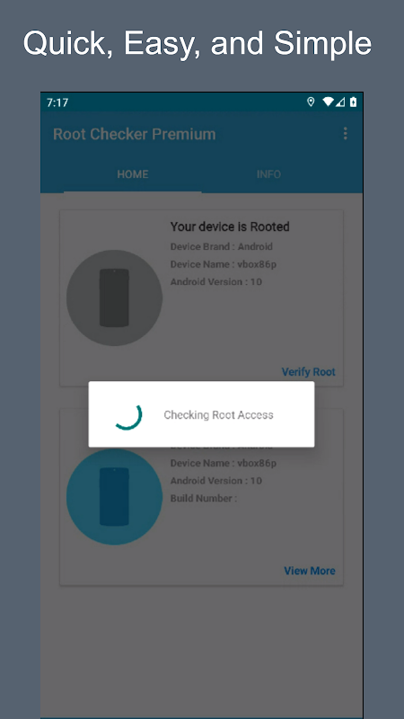 This application will test the device for root (superuser) access using a very simple, quick, and reliable method that has been tested. The su binary is the most common binary used on Android devices to grant and manage root (superuser) access. Root Checker will check and verify that the su binary is located in a common standard location on the device. In addition, Root Checker will verify whether the su binary is properly functioning in granting root (superuser) access.