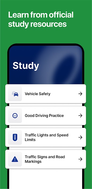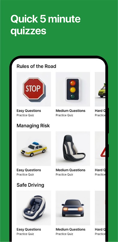 ✔ Ponad 14 quizów praktycznych obejmujących wszystkie sekcje oficjalnych przepisów drogowych RSA.