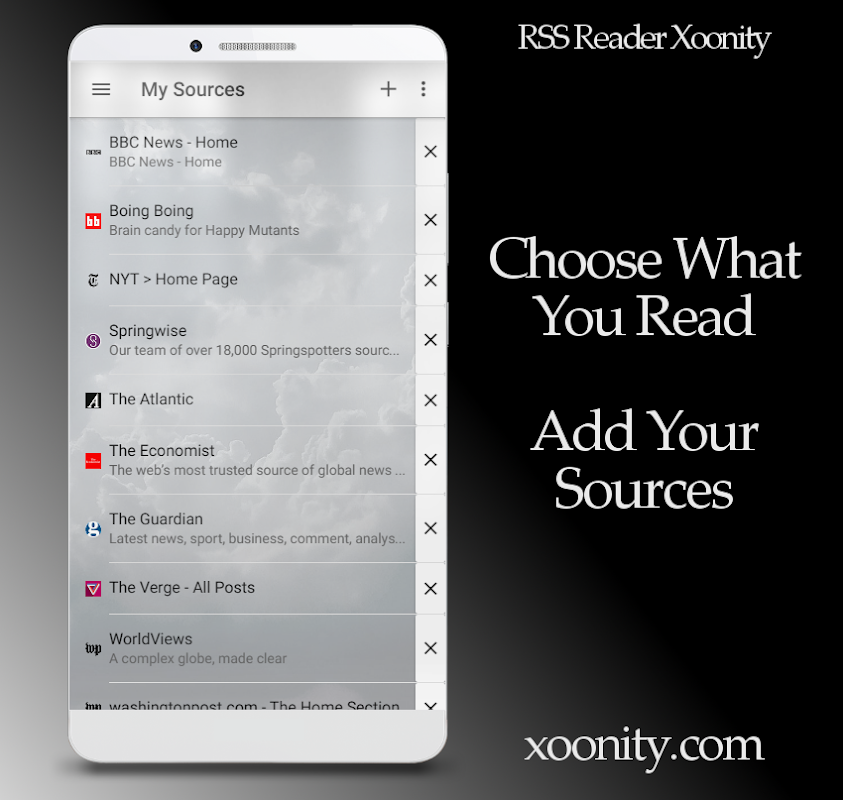 At Xoonity,we're always on the watch, reading news on websites, blogs, RSS feeds and other information sources on the Internet. As we couldn't find a RSS reader for smartphones that addressed our needs, we created our own RSS reader. The aim is to provide users with a free reader that includes wide-ranging features and recognized information sources. Thus we constantly update our apps with additional features. Xoonity RSS reader was designed and developed by avid readers of websites, so if you too are a reader, please download our app, use it and rate it.