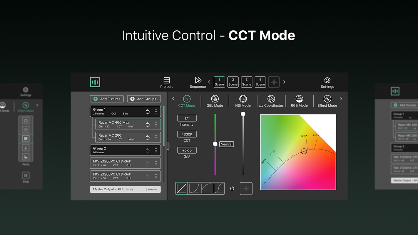 RTX Master umożliwia sterowanie oprawami oświetleniowymi kompatybilnymi z Art-Net od różnych producentów, takich jak Rayzr, Vibesta, F&V za pośrednictwem routera RTX lub dowolnego innego urządzenia kompatybilnego z Art-Net.