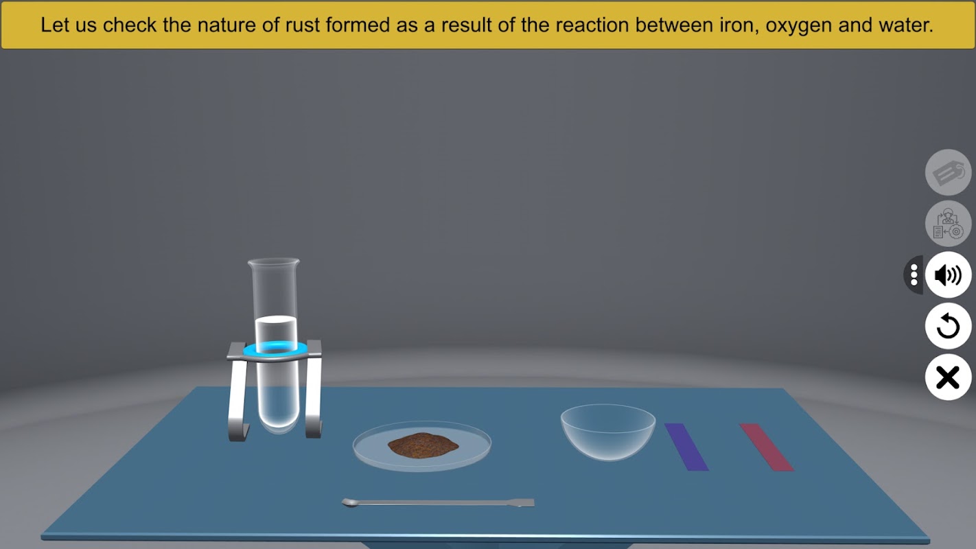 Aplikacja „Test rozwiązania rdzy” oferuje wycieczkę z przewodnikiem, aby zapoznać się z eksperymentem laboratoryjnym, który demonstruje test rozwiązania Rust. Aplikacja przynosi na wyciągnięcie ręki protokół krok po kroku dotyczący eksperymentu. „Test w roztworze rdzy” pokazuje całą aparaturę wymaganą do eksperymentu. Ponadto aplikacja ilustruje całą procedurę eksperymentu, aby pokazać test roztworu rdzy.