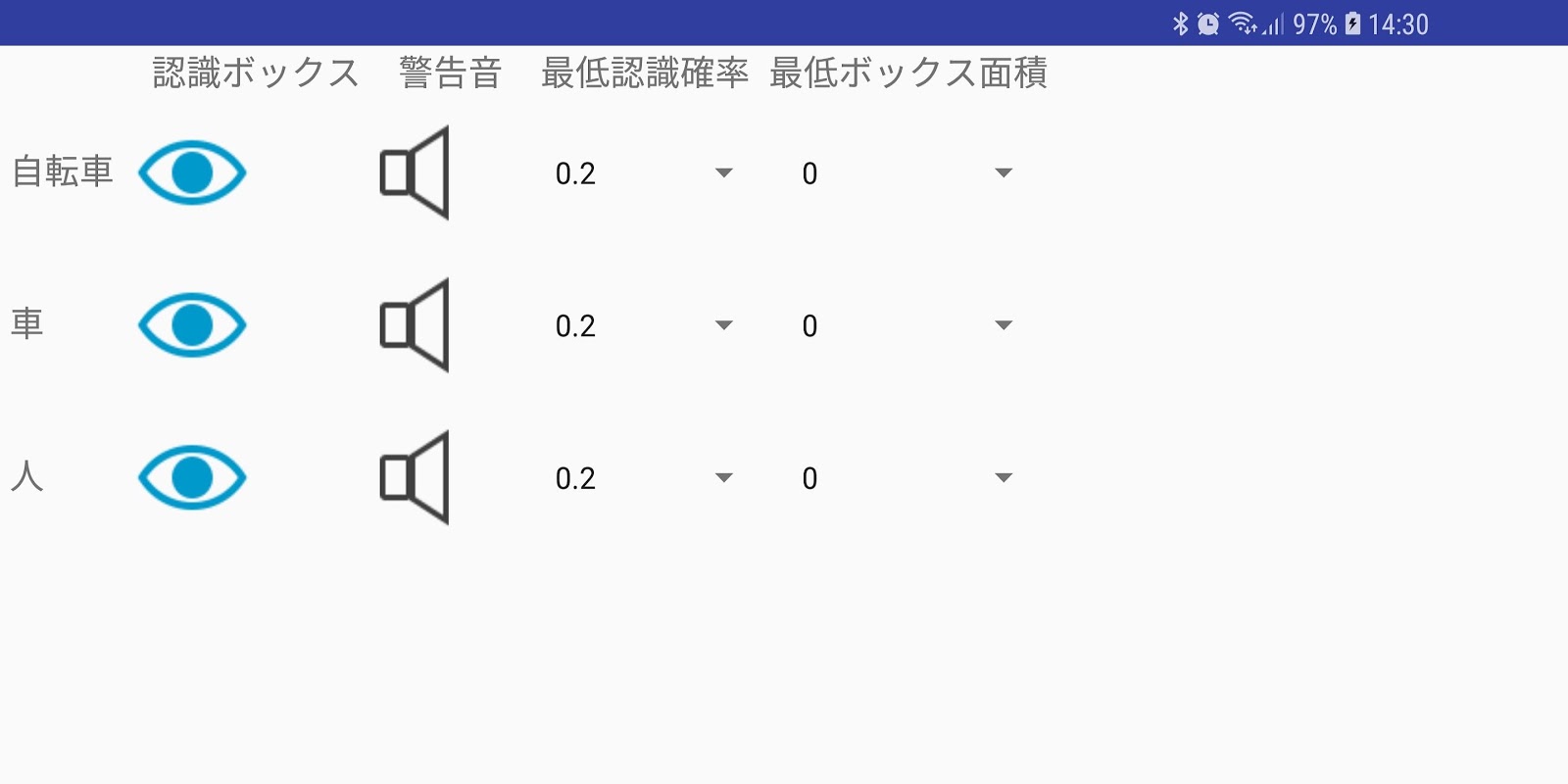 This app uses YOLO object detection technique to detect bicycle, car, and person. Whether to detect each object, minimum detection confidence, minimum bounding box size, and detection sound can be configured in the settings page. It also allows the user to record the video while running the detection.