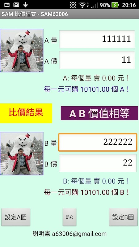 在大型超市或量販店,碰到您喜歡或需要的商品特價促銷時,手機打開本程式, 輸入兩種包裝的內容物 [ 總數量(或總重量) ] 及 [ 總售價 ],按下【開始比價】,程式馬上告訴您哪種包裝較便宜。