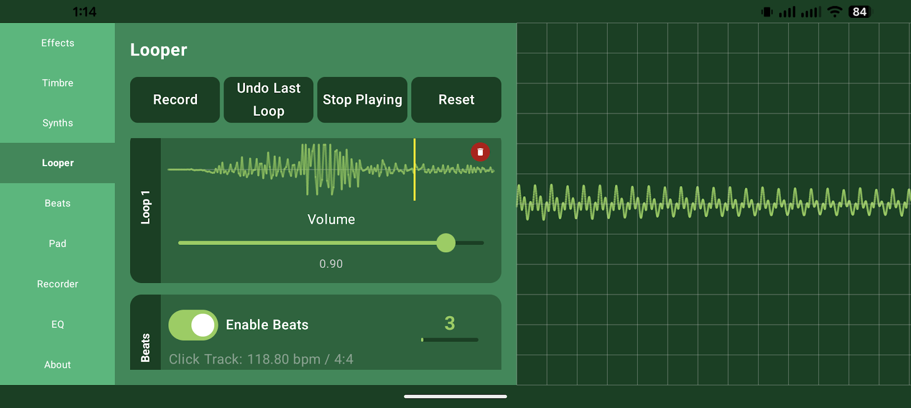 Dostępny jest wielościeżkowy looper i generator beatów do tworzenia pętli syntezatorowych i synchronizowania z nimi ścieżki beat/click. Pętle można modyfikować, przełączać i dodawać w trakcie gry.