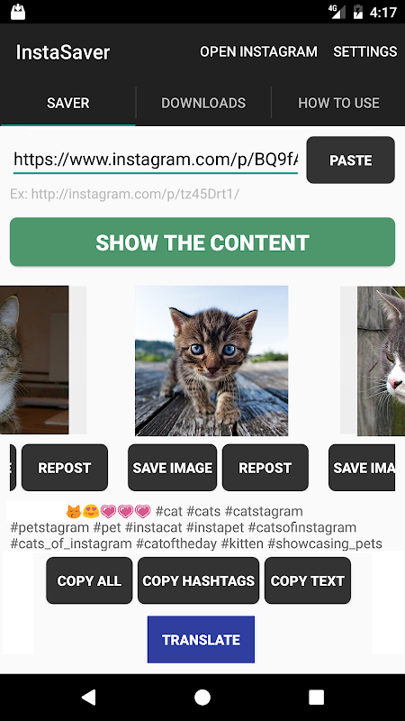 Saver is the first app that will help you to copy text, hashtags, save images & videos from instagram posts to your phone or tablet, so you can share them back on other apps or just keeping them on your device, all in one app, very easy to use, fast & smooth transition between Insta & Saver.