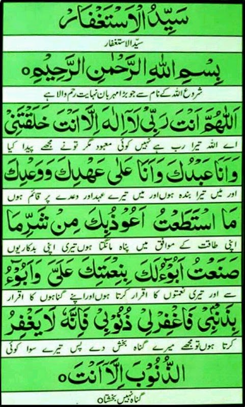 Jo shakhs astaghfar ki Dua subha uthtay sat on parhay Aur din USI foat Ho Jaye tou wo Jannat mai Jaye ga.