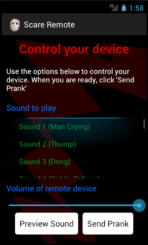Scare Remote allows you to send a prank sound to the remote device and even control how loud you would like it to play.