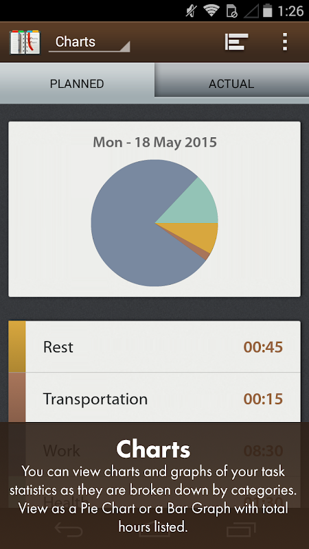 Busy users are provided with a flexible set of categories like “Meals”, “Health”, and “Work”. Tasks are then color coordinated by category for convenience and to monitor their statistics. The app employs in-depth pie-chart and bar graph diagrams to let users see how they spend their time based on category with a quick glance.