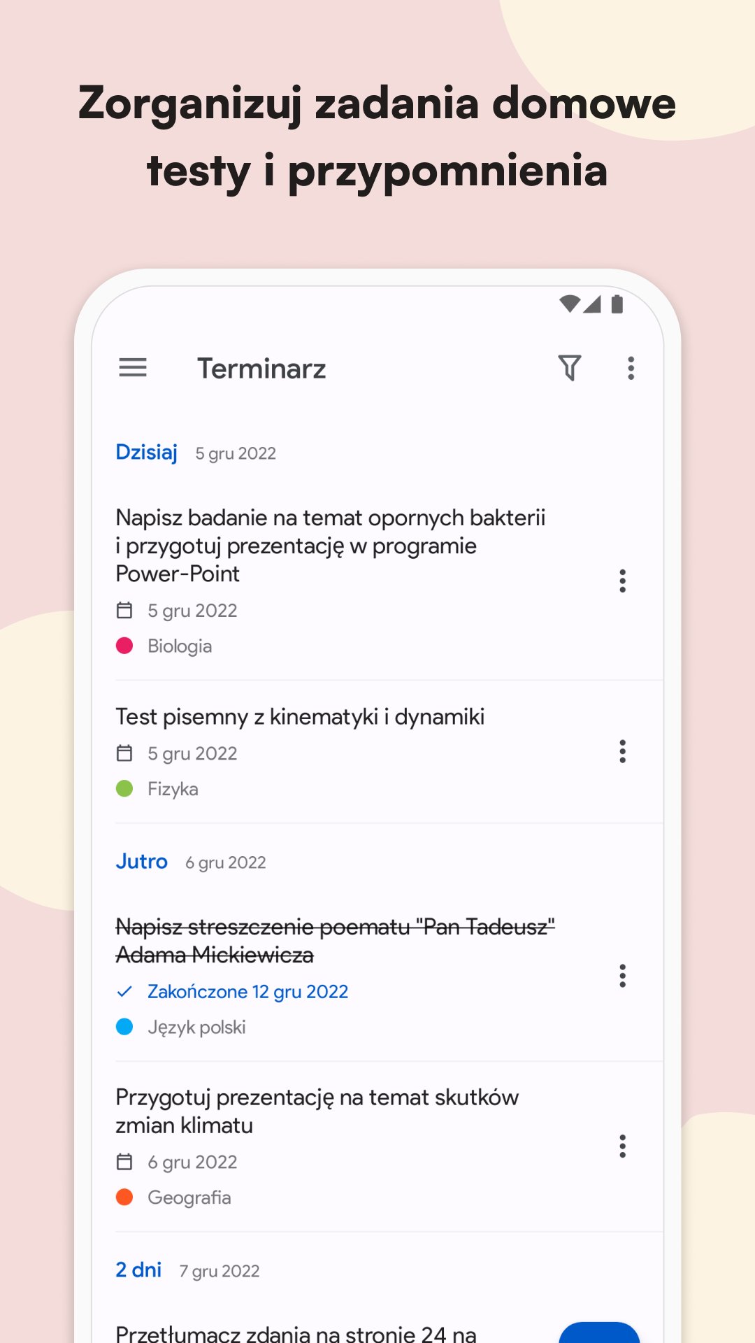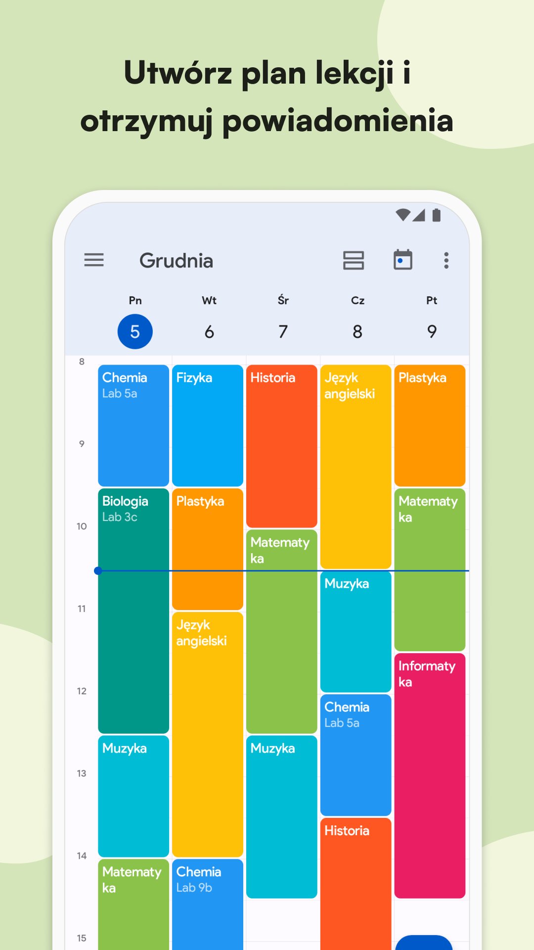 Synchronizuj plan zajęć na wszystkich urządzeniach i zapisuj kopię zapasową danych na Dysku Google.