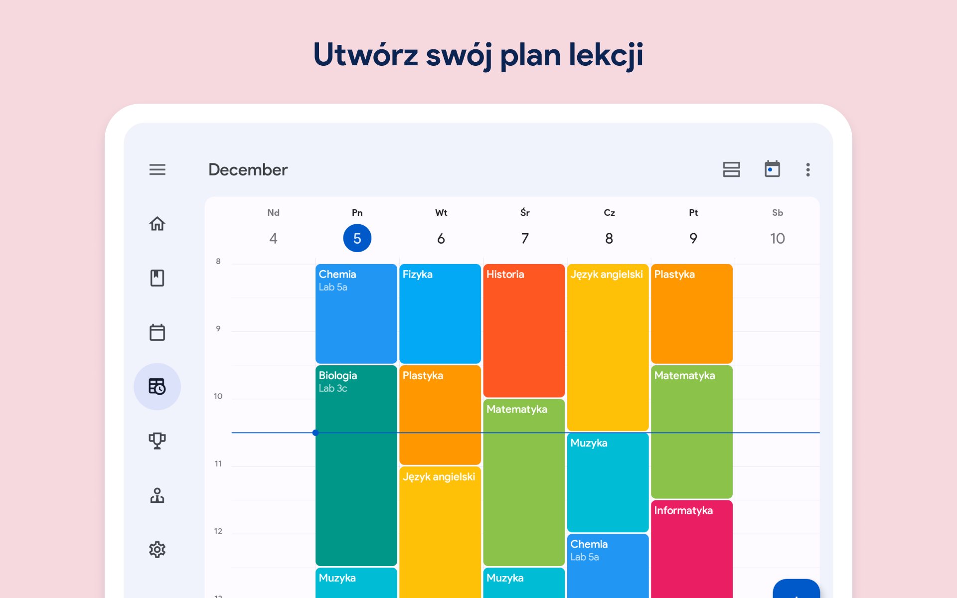 Miej plan zajęć i rozkład dnia zawsze przy sobie i odpowiednio zaplanuj swoją naukę. Plan zajęć jest bardzo wygodny: można przypisać różne kolory do każdego przedmiotu i zobaczyć zdarzenia zapisane w kalendarzu.