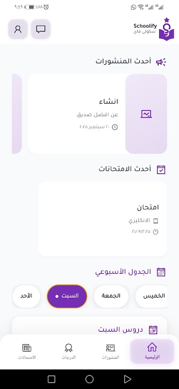 📚 متابعة الدروس والواجبات: يمكن للطالب الاطلاع على الجداول الدراسية، والواجبات المنزلية، والاختبارات بسهولة.