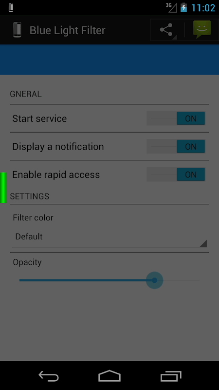 This application reduces the blue light and helps you to avoid insomnia and eye strain caused by blue light. it also gives you a better control over your screen brightness