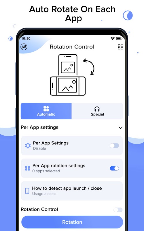 >> Per-App Setting: When you install the app, it automatically rotates the app by enabling the toggle button.