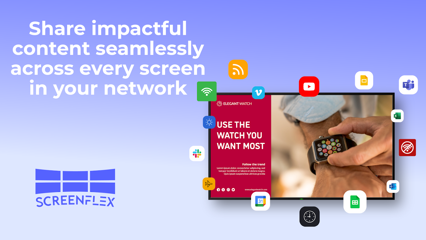 Screenflex to potężna platforma Digital Signage, która w kilka minut przekształca dowolny telewizor, tablet lub urządzenie z systemem Android w dynamiczny wyświetlacz cyfrowy, bez konieczności posiadania specjalistycznego sprzętu ani umiejętności technicznych. Idealna do menu, komunikatów, pulpitów nawigacyjnych, promocji i nie tylko.