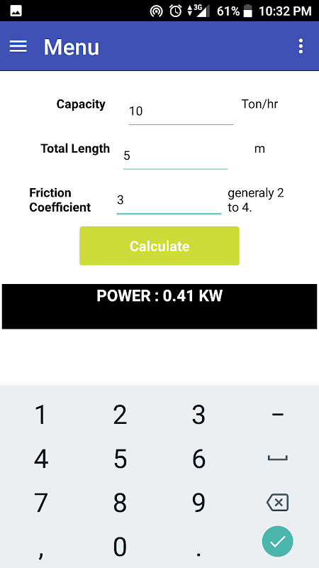 Ta aplikacja buduje do obliczania pojemności przenośnika ślimakowego, prędkości przenośnika i zapotrzebowania na moc przenośnika ślimakowego.