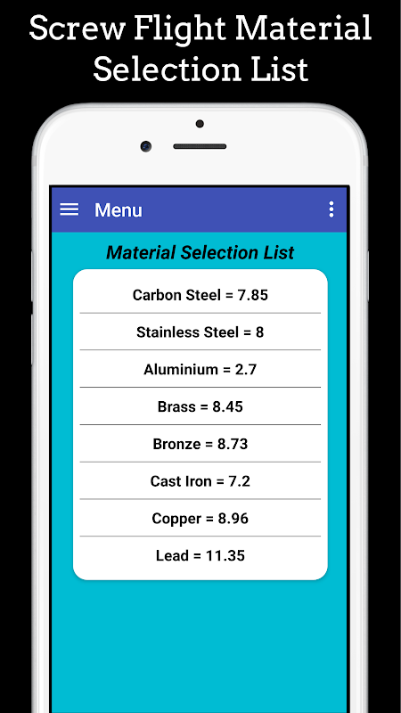 W tej aplikacji wymagane jest wejście na zewnątrz i wewnątrz średnicy śruby, skok lotu, grubość materiału i ciężar właściwy materiału konstrukcyjnego, takiego jak stal węglowa, stal nierdzewna, miedź, mosiądz lub brąz.