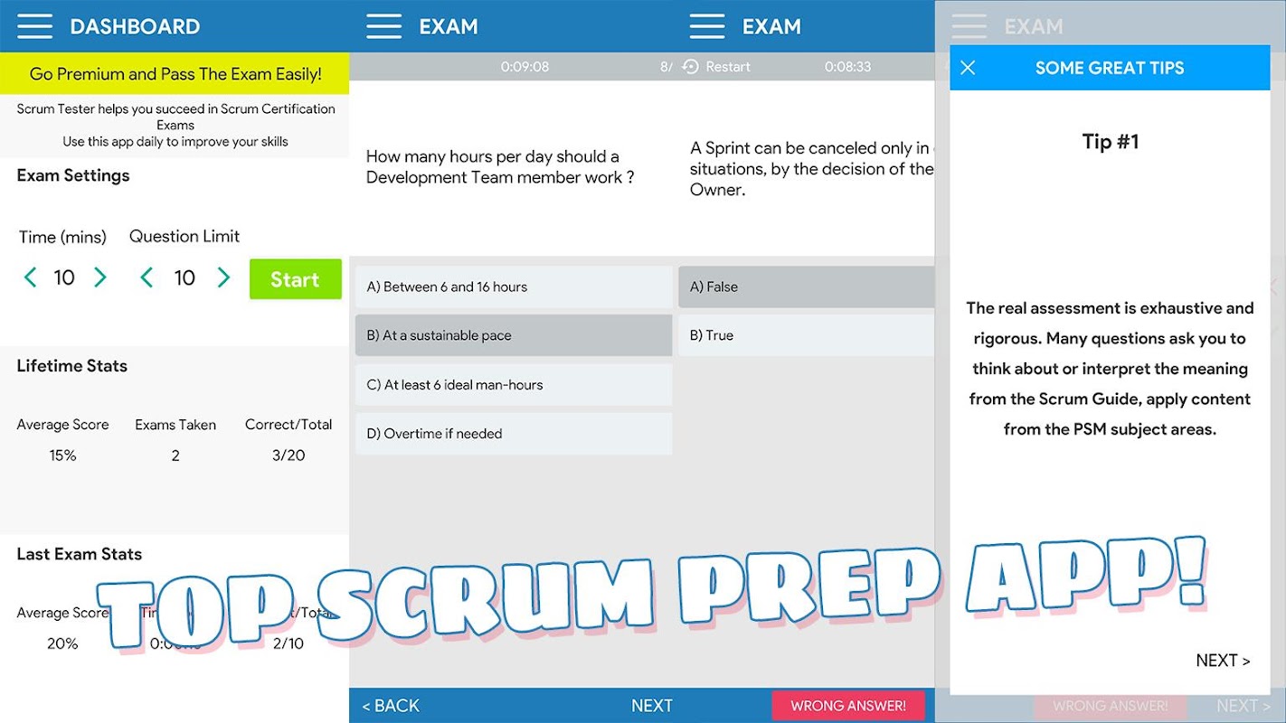 Książeczka dotycząca frameworka Scrum ma tylko 16 stron, ale prawdziwy egzamin jest trudniejszy niż myślisz. Potrzebujesz dobrej praktyki przed przystąpieniem do egzaminu PSM lub egzaminu CSM; w przeciwnym razie możesz stracić pieniądze. Ta aplikacja została zaprojektowana, aby uczynić Cię odnoszącym sukcesy mistrzem Scrum.