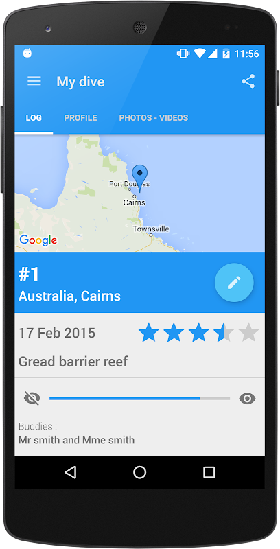 And even more ! Get statistics of your logs, your dives on Google Map, share your logs, photos and videos with your buddies, ...