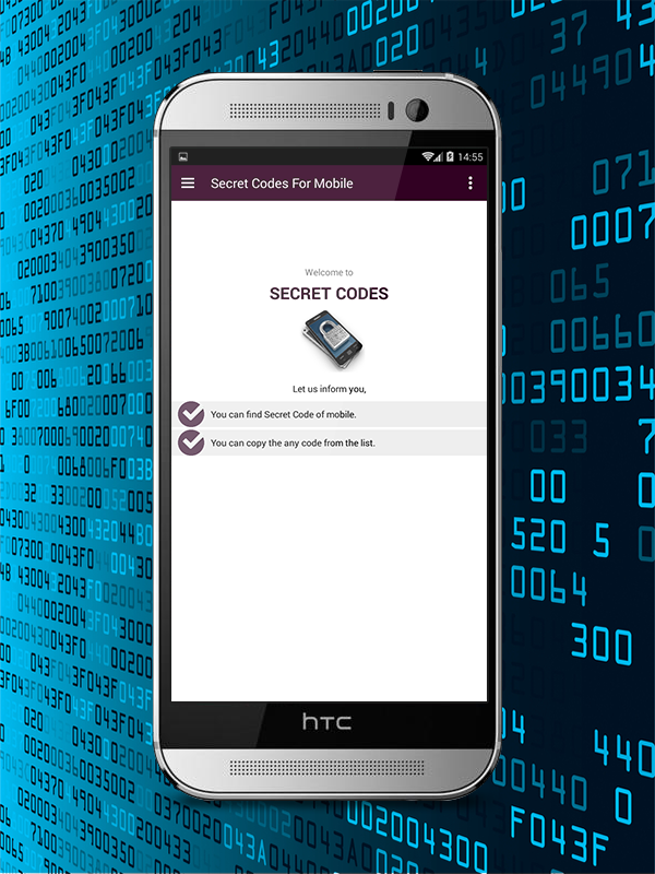 Secret Codes For All Devices Every mobile phones have secret codes to access secret or operative functions of the mobile. secret codes for android devices You may not know these codes. Some of these codes make it easy to check functionality of a phone. It includes secret codes of iPhone and android phones. It includes all the android phone company like Samsung, Nokia, Sony, HTC, Mi Note.You can directly dial these codes or copy the codes from the list and paste it on dialer to dial the number. Mobile Secret Code application include the android secret code of all mobile device like Samsung, Sony, Lenovo, Motorola, XIAOMI/MI, BlackBerry, China, HTC, Karbonn, LG, MicroSoft/Windows and OPPO , Apple , Vivo ...Application Covers The Following:- Samsung mobile secret code- Samsung phone codes- Samsung model code- Samsung hidden menu/codes- lg phone secret codes- HTC codes- Moto secret code- Code for check samsung phone- XIAOMI/MI Secret Code- HUAWEI Secrer Code- Oppo Secret CodeWhat is USSD codeUnstructured Supplementary Service Data (USSD), sometimes referred to as "Quick Codes" or "Feature codes", is a protocol used by GSM cellular telephones to communicate with the service provider's computers. USSD can be used for WAP browsing, prepaid callback service, mobile-money services, location-based content services, menu-based information services, and as part of configuring the phone on the network.IMPORTANT! Some manufacturers not allow the use of these codes and they may not work on your device. By using secret codes you can change some of your device settings. Use at your own risk!Enjoy and have a fun!