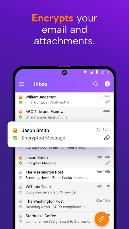 Nikt oprócz twoich odbiorców - ani dostawcy poczty e-mail, firmy internetowej, złodziei tożsamości, reklamodawców, szpiegów rządowych, a nawet nas - nie może kiedykolwiek odczytać zaszyfrowanych wiadomości e-mail i załączników.