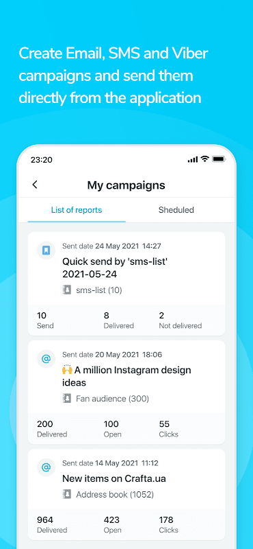 Aplikacja SendPulse umożliwia dodawanie subskrybentów do list, wysyłanie kampanii e-mailowych oraz przeglądanie szczegółowych raportów i analiz. Możesz utworzyć kampanię na komputerze i wysłać ją później z telefonu lub tabletu.