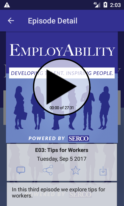 With this app you are always connected to the latest episodes and the show. Quickly star episodes and save them to a list so you can easily enjoy them over and over! This app has a Car mode too! Rotate your phone to display larger playback controls. It is the best and most convenient way to access EmployAbility.