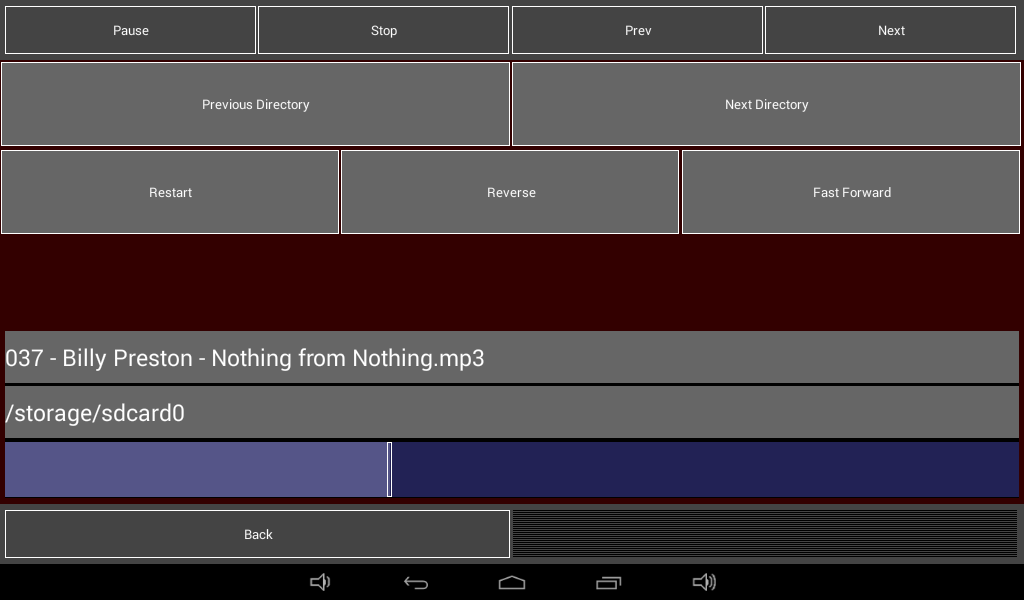 SF Music Player is designed for straightforward operation. With no wifi or internet access required, no personal data retrieved, no unnecessary operations, and no distracting graphics or cover art, it plays music and otherwise keeps out of your way.