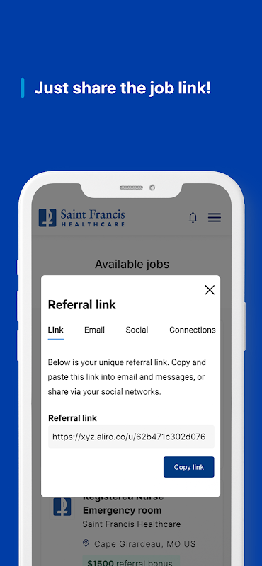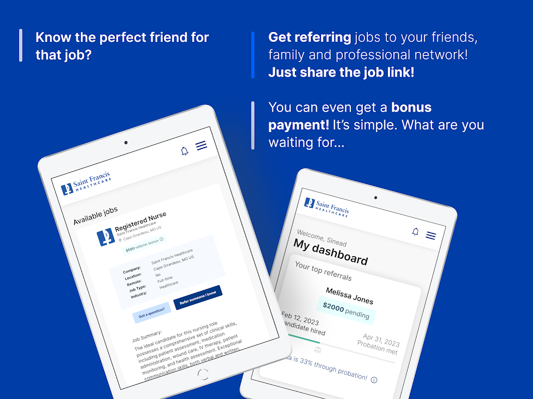 Odblokuj potencjał swojej sieci zawodowej dzięki aplikacji Programu Poleceń Pracowników Saint Francis Healthcare! Nasza przyjazna dla użytkownika aplikacja została zaprojektowana, aby pomóc naszym pracownikom w płynnym udostępnianiu ofert pracy w sieci zawodowej.