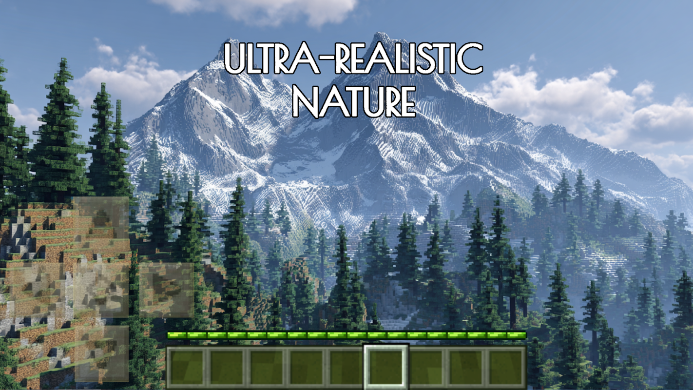 Ultrarealistyczny świat MCPE charakteryzuje się realistyczną grafiką RTX i nowoczesnymi ulepszeniami wizualnymi w shaderach i teksturach dla MCPE (BE), które są osiągane dzięki realistycznej symulacji oświetlenia, efektom cieni i chmur, odbiciom słońca oraz ultrarealistycznej animacji wody z falami i odbiciami w świecie Minecraft, przenosząc wrażenia z gry na zupełnie nowy poziom.