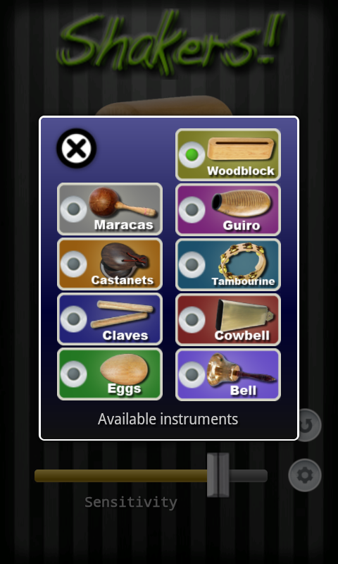 Wirtualny shaker z 10 różnymi instrumentami, w tym marakasy, kastaniety, claves, jaja piaskowe, blok drzewny, guiro, tamburyn, dzwon i oczywiście dzwonek.