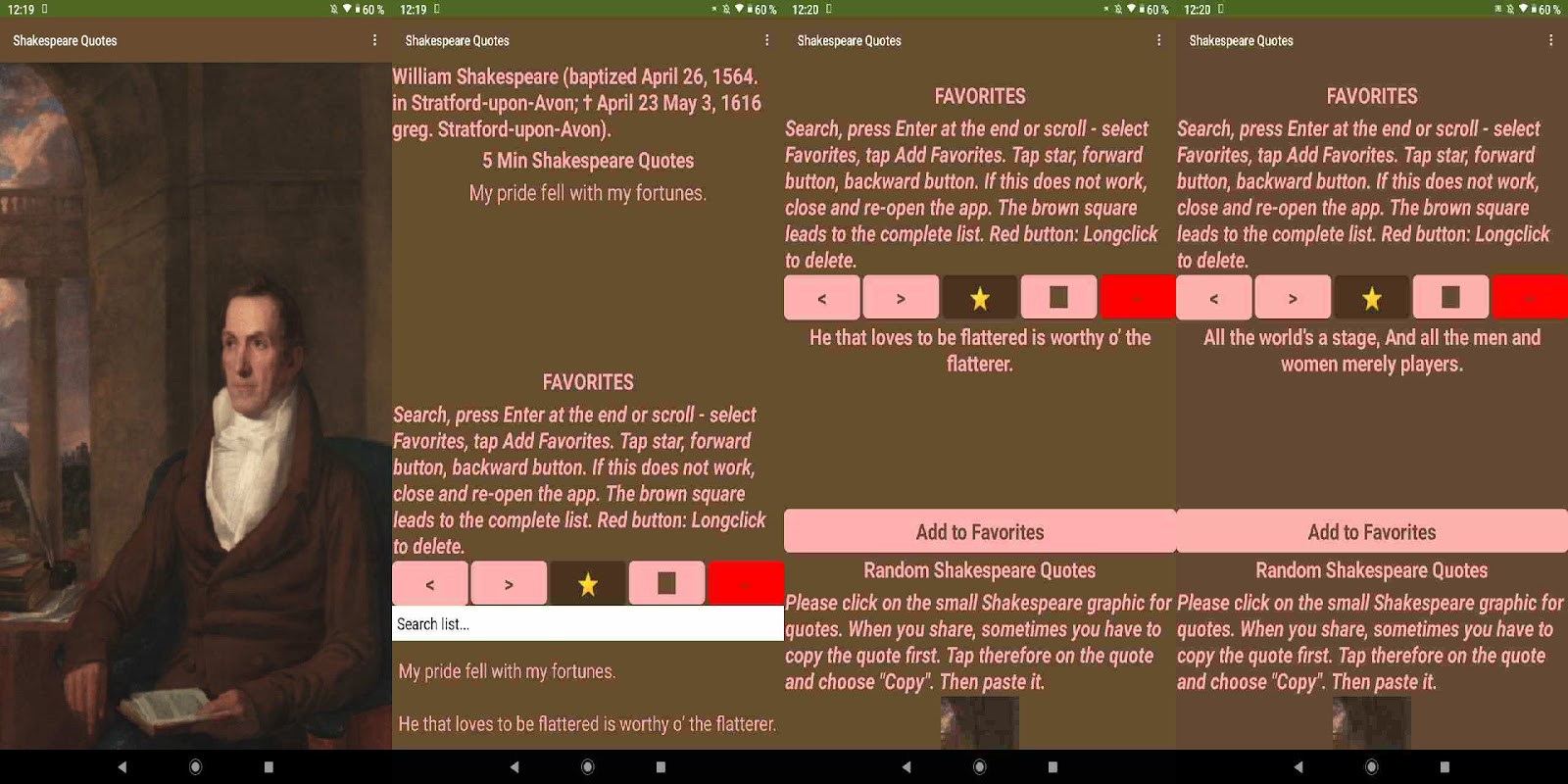 ⭐ Funkcja Ulubione: zapisuj najbardziej cenione cytaty i sonety Szekspira, aby mieć do nich łatwy dostęp.
