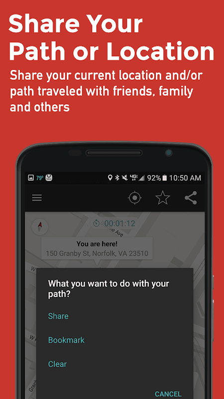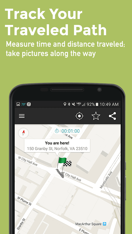 The app also lets you track your travel path, whether you are walking, running or driving - even boating or flying. You can pin photos to the map, measure the time and distance traveled, and switch to traffic maps and satellite view. You can share your path with others via email, text message or other social apps.