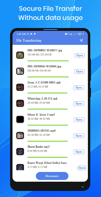 This application share files from device to device without cable. Yo can transfer files or media through wifi with less permissions.