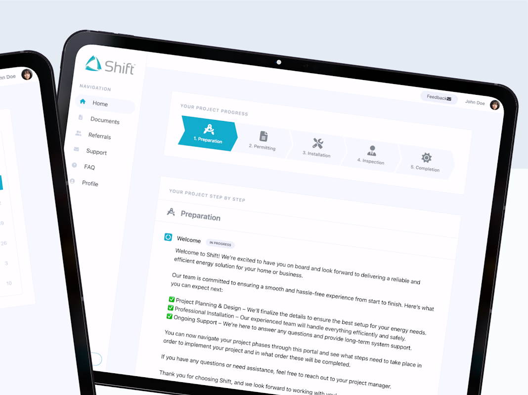 Śledź proces instalacji w czasie rzeczywistym, monitoruj produkcję i zużycie energii słonecznej po zainstalowaniu systemu, zarabiaj pieniądze polecając znajomym i rodzinie, otwieraj nowe zgłoszenie do pomocy technicznej lub aktualizuj dane swojego konta za pomocą aplikacji Shift.