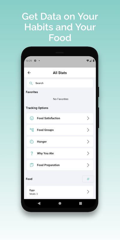 - Przeglądaj statystyki dotyczące konkretnego jedzenia i zobacz, jak zmieniają się Twoje nawyki w zależności od spożywanego jedzenia.