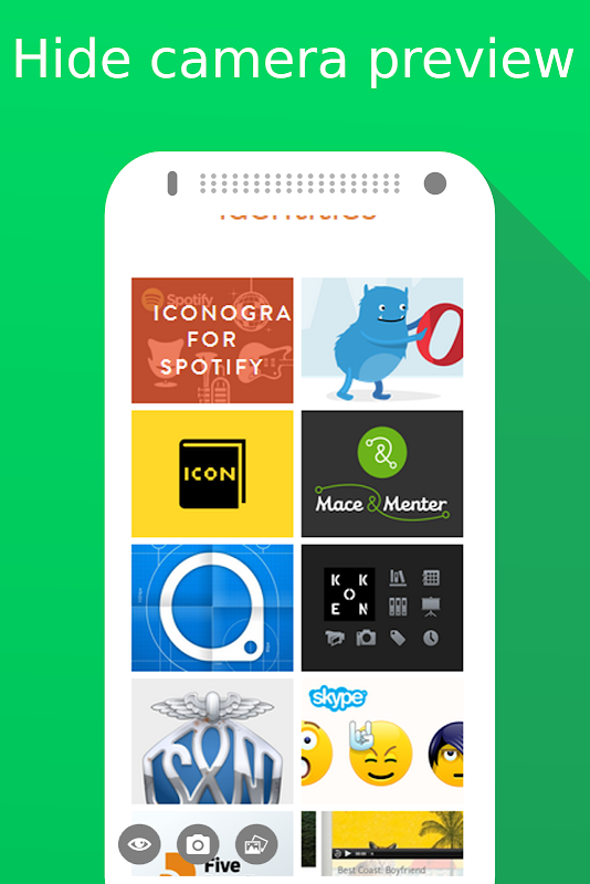 - Ẩn/hiện màn hình camera preview, thay thế màn hình camera bằng một màn hình bất kỳ, khiến người đứng bên không biết là thiết bị đang chụp ảnh, quay phim