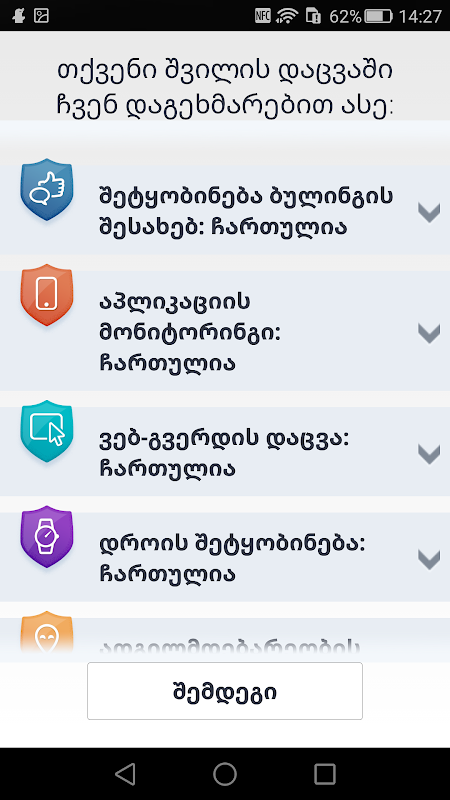 აპლიკაციის საშუალებით თქვენ აკონტროლებთ თქვენი შვილის ინტერნეტ მოხმარებას - იცავთ მას კიბერ შეტევებისგან, ადევნებთ თვალს მის ადგილმდებარეობას, ამონიტორინგებთ მისი გამოყენებული საიტების სიას