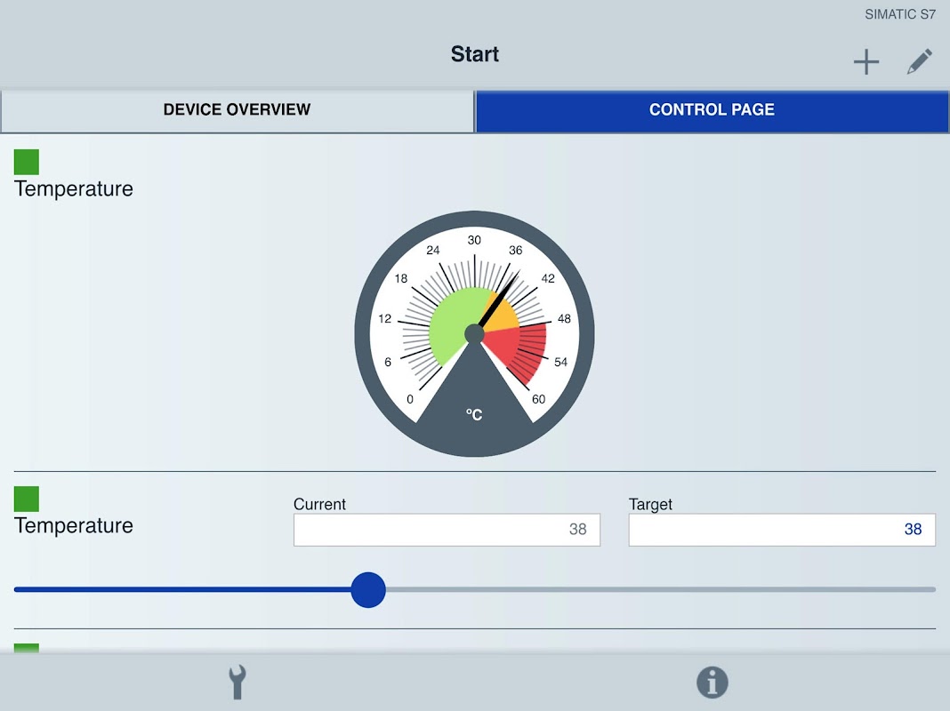 • Configure a control page to operate and monitor variables with a set of projectable control-types: gauge, button, slider, bar graph and output field. Of each control type, one control can be configured for free. If more controls of one control type are needed, the respective control type needs to be unlocked via in-app-purchasing once. After unlocking, as many controls of the respective type as desired can be configured. However, the maximum number of controls is limited to 50.