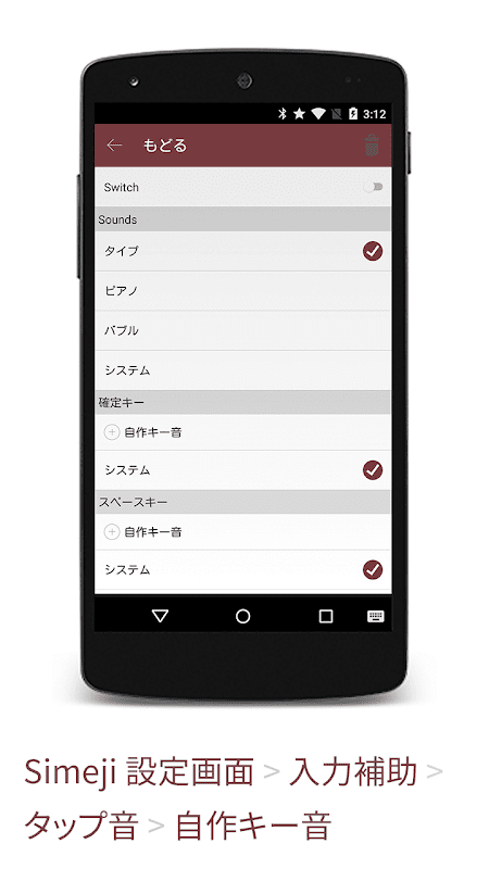 本アプリをインストール後、Simejiのキーボードを表示している時に、コントロールパネル設定をタップして「キー音ボタン」>自作キー音をタップ!