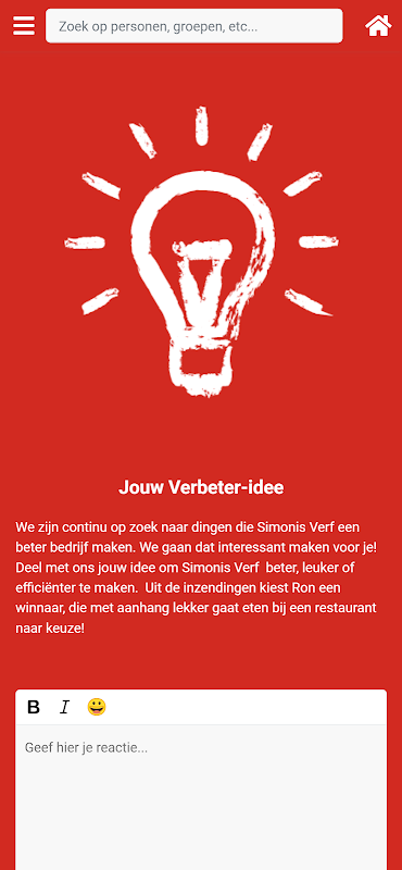 Aplikacja Simonis Paint; platforma internetowa umożliwiająca szybkie i łatwe dzielenie się nową wiedzą, pomysłami i sukcesami ze swoimi współpracownikami. Dzięki przydatnym funkcjom, takim jak oś czasu, kalendarz wydarzeń, grupy i specjalne promocje społeczności, będziesz informowany w czasie rzeczywistym o wszystkim, co dzieje się u Twojego pracodawcy. Dzięki powiadomieniom push przypominają Ci o reakcjach współpracowników, ale także o zadaniach, które musisz wykonać. Pomyśl o przygotowaniu się do przeglądu wyników lub realizacji umów zawartych w ramach planu rozwoju. Omówiono wszystkie aspekty innowacyjnego wywiadu postępowego; Twoje kompetencje, ambicje, szkolenie, potencjał, satysfakcja z pracy lub satysfakcja z pracy. Praca nad osobistymi celami jest łatwo zintegrowana z Twoją codzienną pracą. Wszyscy nowi koledzy otrzymują za pośrednictwem aplikacji cyfrowy program wprowadzający, a odchodzący pracownicy - analizę wyjścia. Regularnie organizowany jest zabawny quiz wiedzy lub szkolenie produktowe.