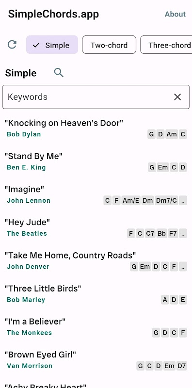 Aplikacja oferuje szeroką gamę zestawów akordów w postaci 2 akordów, 3 akordów, 4 akordów i innych progresji, dzięki czemu granie ulubionych utworów staje się łatwe. Każda progresja akordów jest sprawdzana, a arkusze utworów zostały zaprojektowane tak, aby ułatwić ich grę, pozwalając Ci skupić się na radości z nauki i zapamiętywania. Aplikacja Simple Chords będzie także służyć jako Twój kieszonkowy śpiewnik!