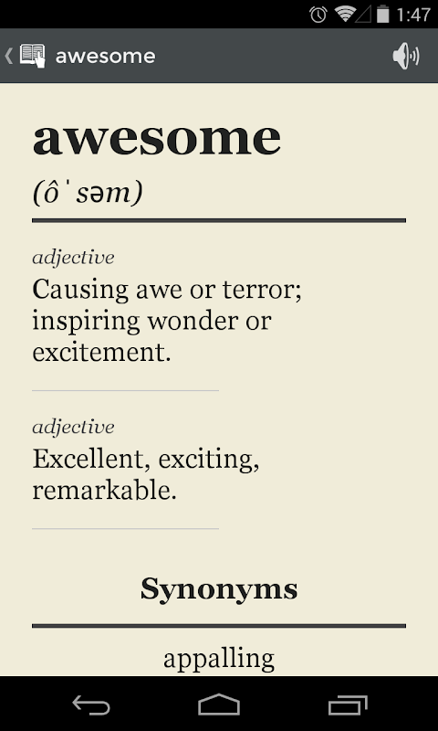 Simple dictionary gives you that information in a distraction free and easy to digest format. It's powerful as well, with over 300,000+ definitions from the worlds top open dictionaries, including Wiktionary, Merriam Webster, Wordnet, Wordnik API, Century, and AHD.