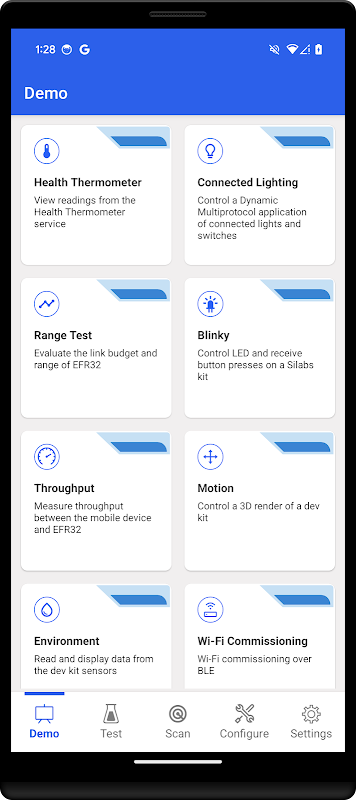 Simplicity Connect zawiera wiele wersji demonstracyjnych umożliwiających szybkie testowanie przykładowych aplikacji w Silicon Labs GSDK. Oto przykłady demonstracyjne: