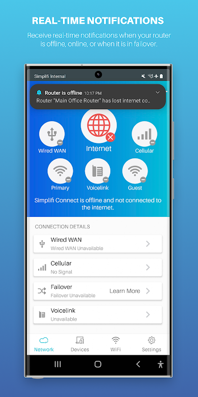 Dzięki prostej konstrukcji, skanerowi kodów QR i łatwym do wykonania krokom aplikacja Simplifi Connect pomaga nie tylko zrozumieć podstawy sieci i zarządzać nimi (konfiguracja, sprawdzanie siły sygnału komórkowego, aktualizacja oprogramowania sprzętowego, zmiana haseł, przeglądanie urządzenia w sieci itp.), ale jest to także jedyna aplikacja zaprojektowana, aby pomóc w skonfigurowaniu ochrony przed przełączaniem awaryjnym, dzięki czemu Twoja firma i dom będą chronione w przypadku zakłóceń w Internecie. Aplikacja i wszystkie jej funkcje są bezpłatne i działają zdalnie przez Internet lub lokalne połączenie Wi-Fi z routerem Simplifi Connect. Można ich używać do zarządzania jednym lub setkami routerów za pośrednictwem jednej aplikacji.