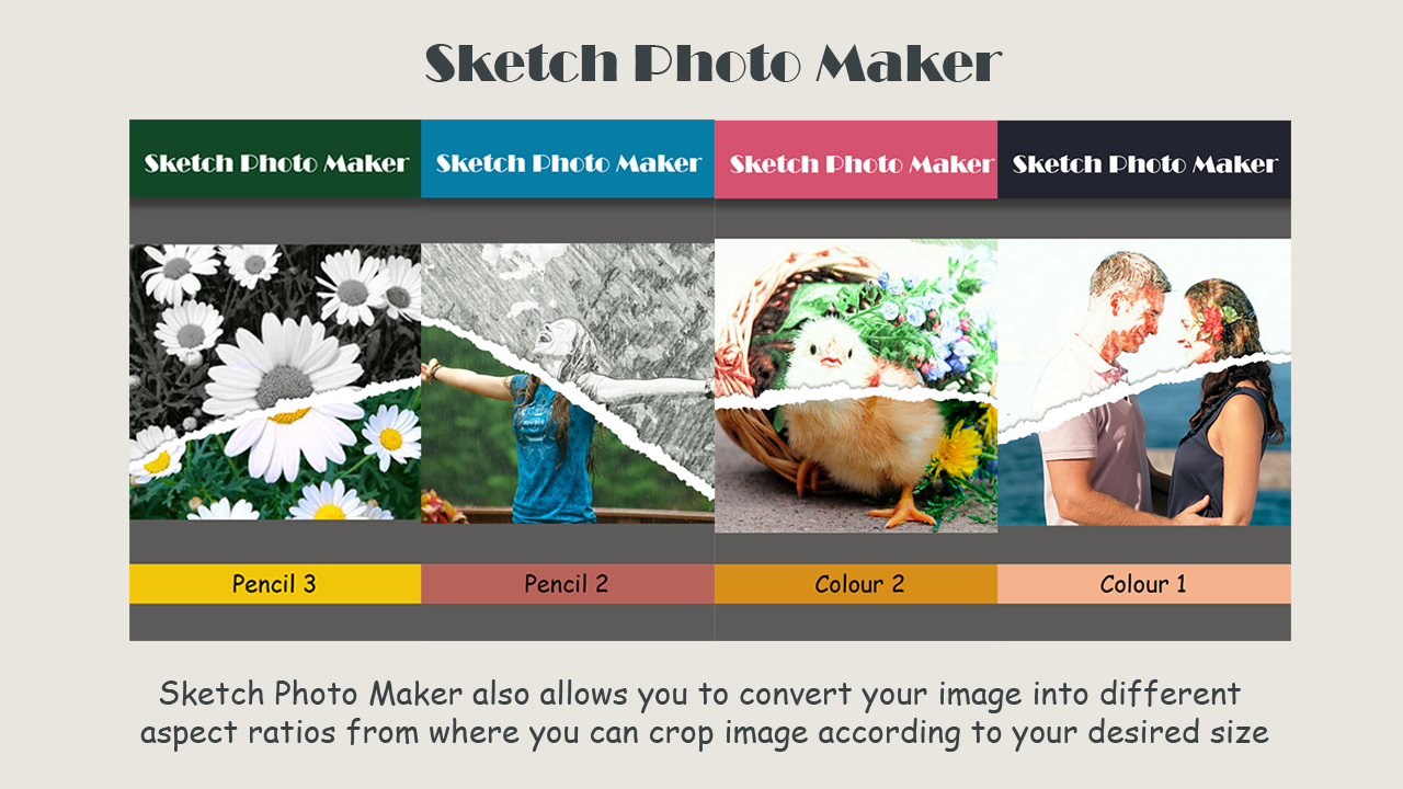 Sketch Photo maker is an Application that can make your photo looks like a real sketch photo.Be an artist that helps you to drawing a real sketch of your images by using Sketch Photo Maker.We support both black-white and color sketch with 10 kinds of wonderful effects including: PencilSketch, ColorPencil, SimpleSketch, ComicB&W,BlackBoardColor and PencilSketch2 etc.Sketch Photo Maker is best application in market with its professional features like to crop your desired image with different aspect ratios.This app is very simple just pick a photo from your Gallery and convert it into a realistic drawing sketch because there is no use any high integration.